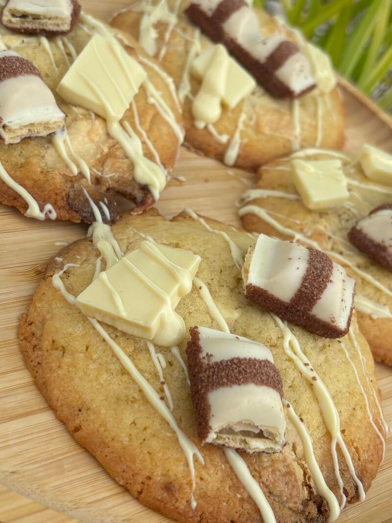 Un cookie garni de morceaux de chocolat blanc, de kinder bueno blanc et de chocolat blanc fondu